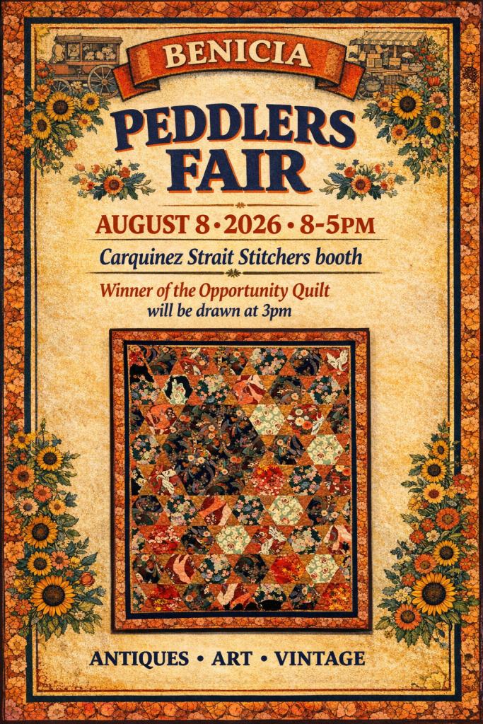 Join us at the Benicia Peddlers Fair! Visit the Carquinez Strait Stitchers booth to see quilts, handmade items, and the Opportunity Quilt drawing at 3 pm.